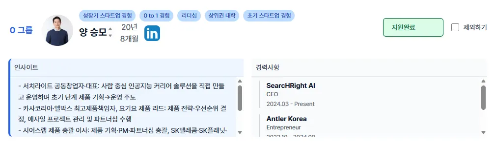 서치라이트는 이 접근을 바꿉니다. 후보자의 재직 시점의 회사 단계, 조직 규모 변화, 제품 출시 시점, 투자와 사용자 수 등 외부에서 관측 가능한 데이터를 결합해 경험의 구간과 맥락을 복원합니다. 그 결과 HM은 후보자의 “0 to 1을 했다”는 주장을 믿을 필요 없이, 왜 이 후보가 지금 우리 조직에 필요한 경험을 갖췄는지를 근거로 판단할 수 있습니다.