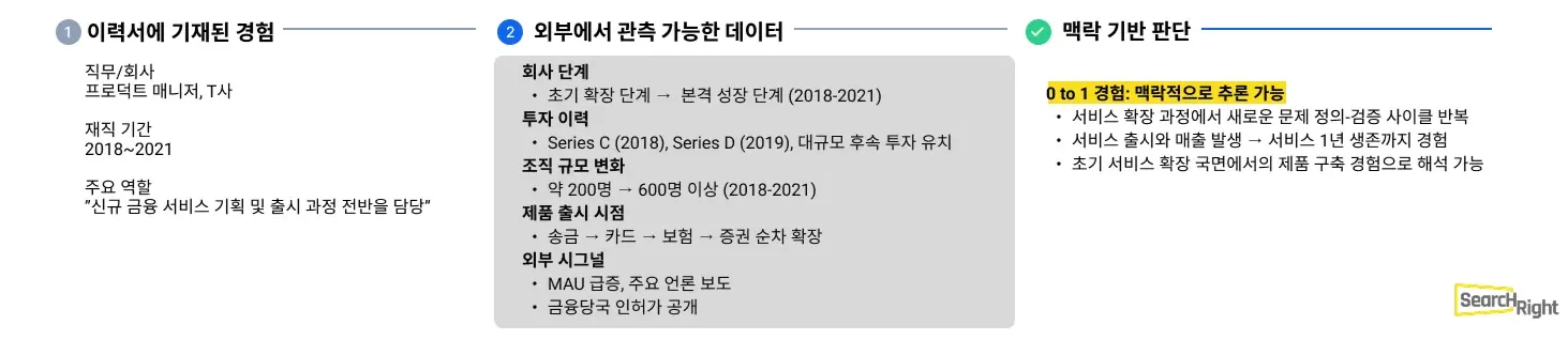 | '0 to 1' 판단 | 이력서에 명시된 경우만 확인 가능 | 경험의 구간과 맥락을 데이터로 복원 |