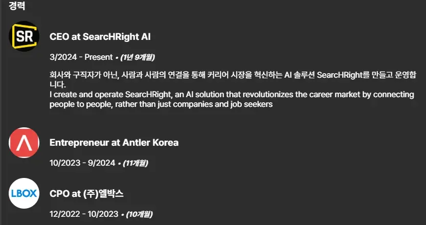 | 이력 표현 | 재직 시기와 직함 중심 나열 | 재직 시점의 회사 단계·맥락 기반 구성 |
